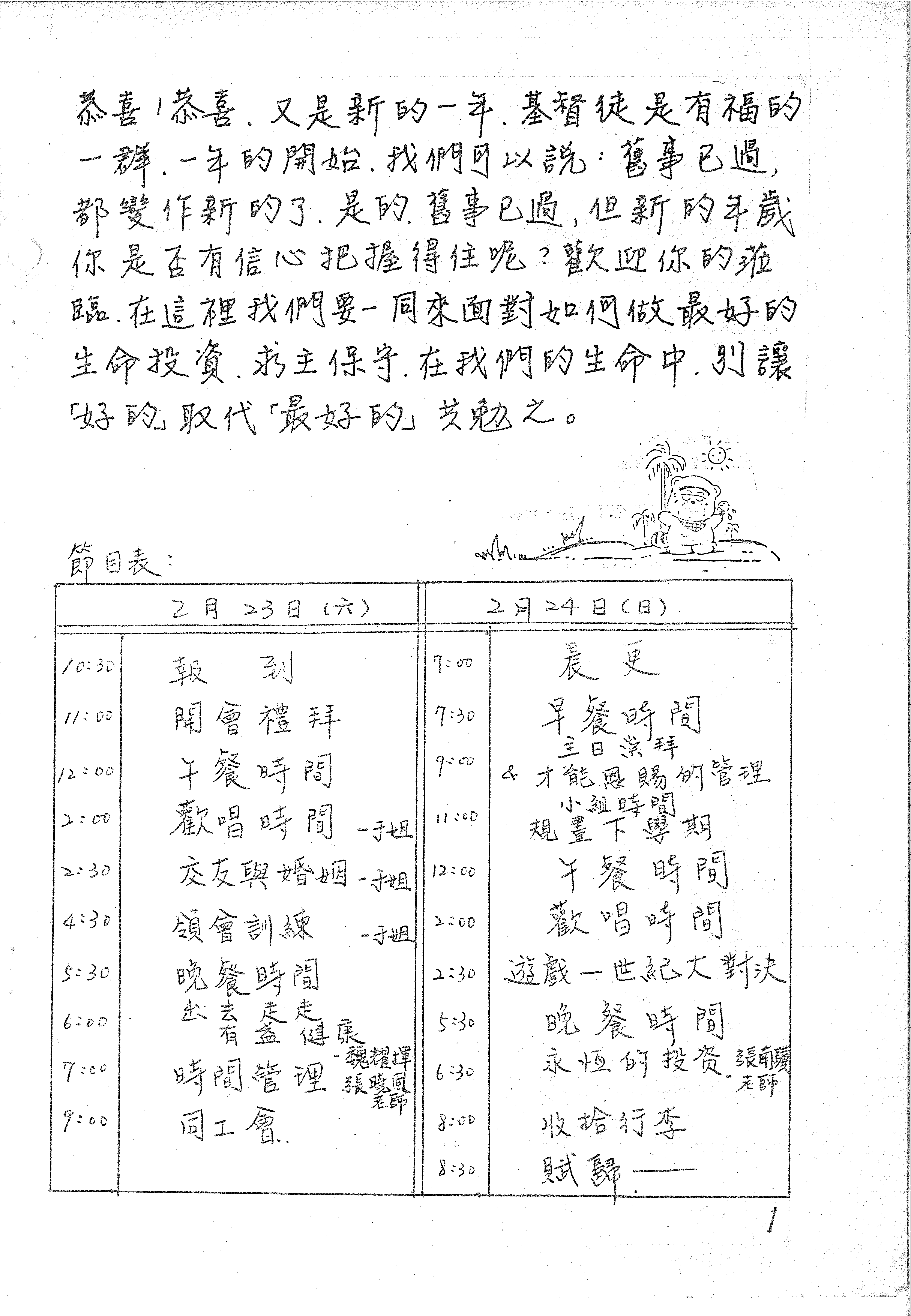 恭喜!恭喜,又是新的一年,基督徒是有福的 一群,一年的開始,我們可以說:舊事已過, 都變作新的了。是的,舊事已過,但新的年歲 你是否有信心把握得住呢?歡迎你的蒞 臨,在這裡我們要一同來面對如何做最好的 生命投資,求主保守,在我們的生命中,別讓 「好的」取代「最好的」,共勉之。