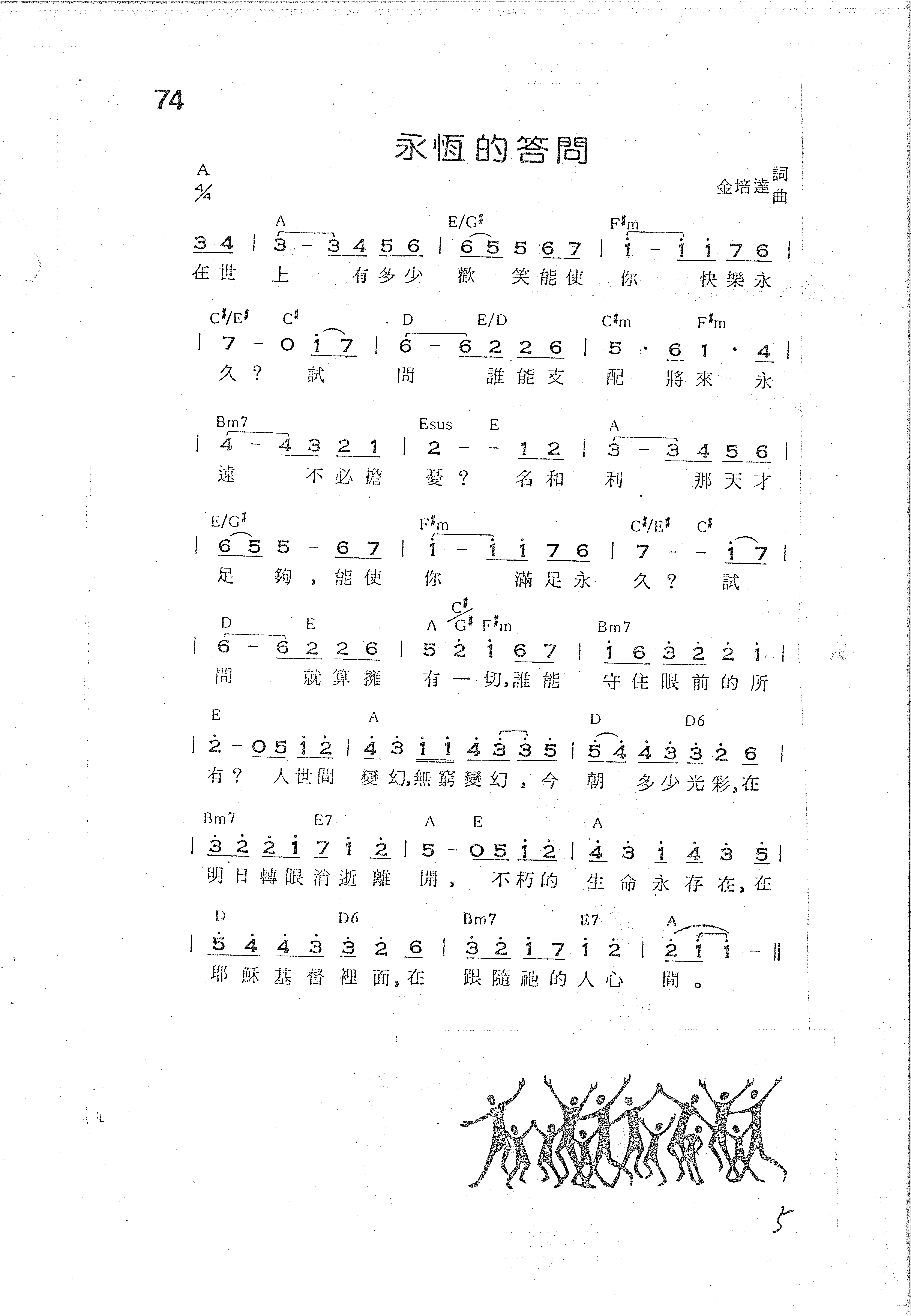 Bm7 E7 A E A | .3 .2 .2 .1 7 .1 .2 | 5 - 0 5 .1 .2 | .4 .3 .1 .4 .3 .5 | 明 日 轉 眼 消 逝 離 開, 不 朽 的 生 命 永 存 在, 在
