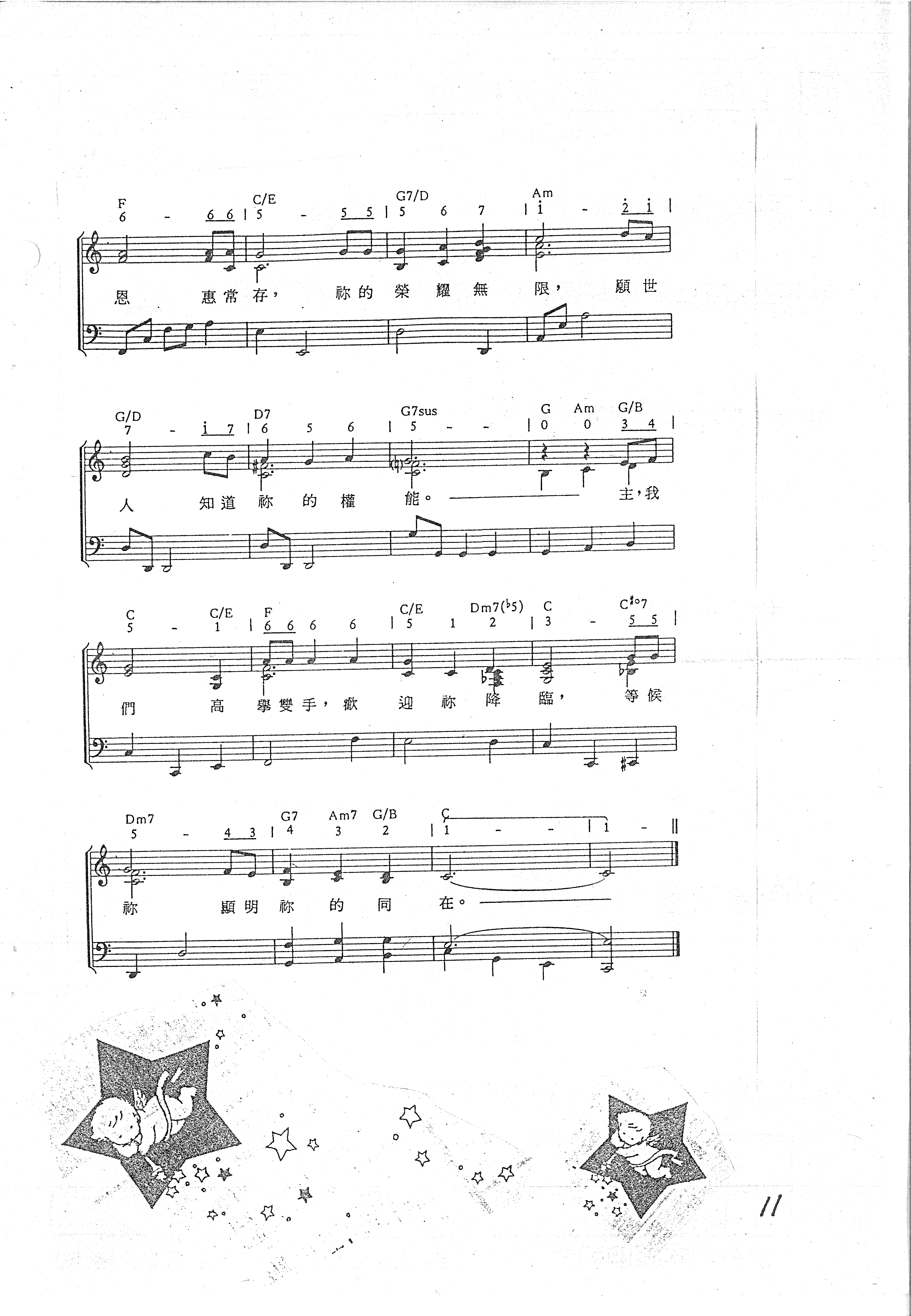 F C/E G7/D Am 6 - 6 6 | 5 - 5 5 | 5 6 7 | i - 2 i | 恩 惠常存, 祢的榮耀無限, 願世