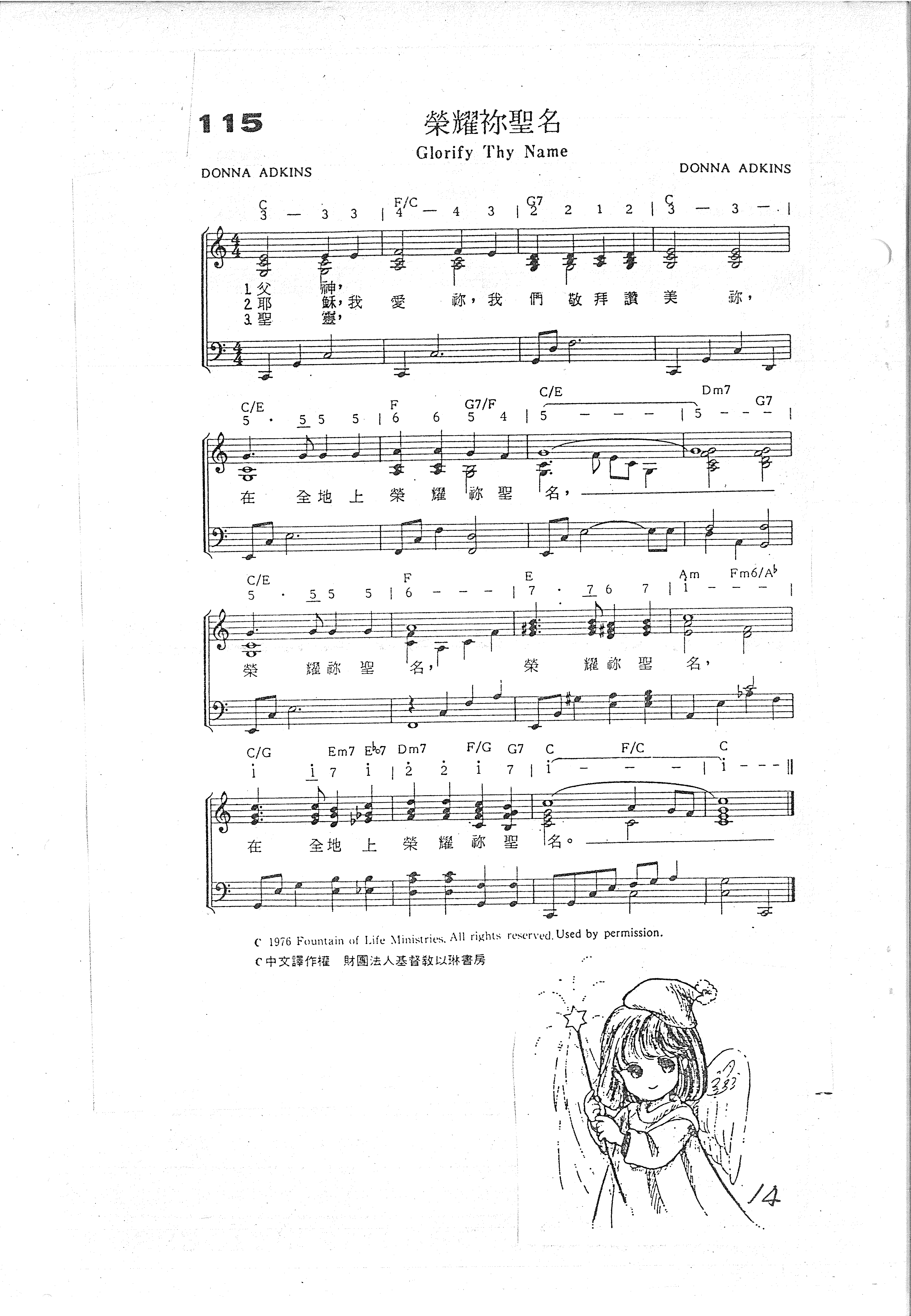 C/G Em7 E♭7 Dm7 F/G G7 C F/C C i i 7 i | 2 2 | i 7 | i - - - | | i - - || 在 全 地 上 榮 耀 祢 聖 名。