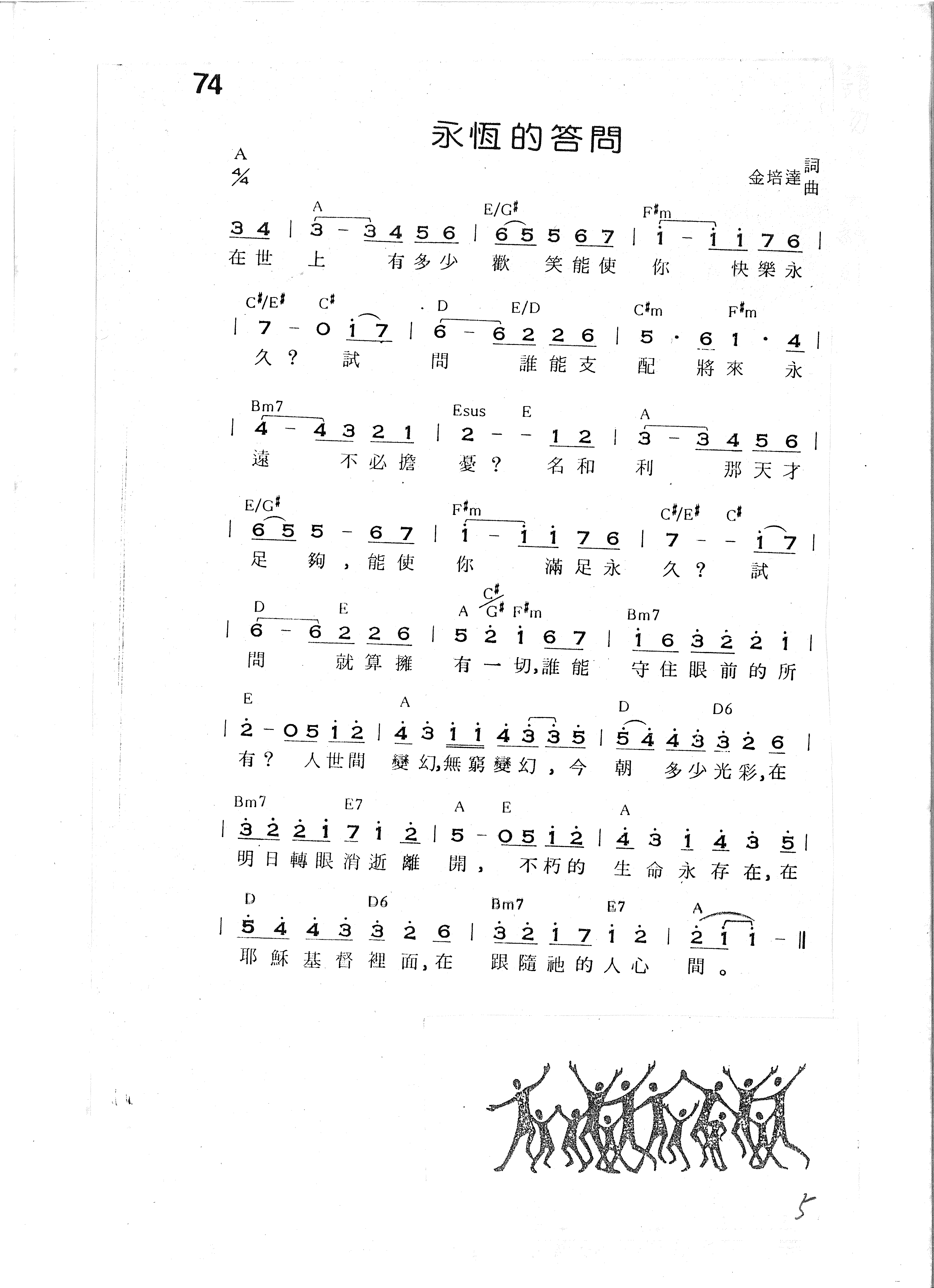 Bm7 E7 A E A | 3̇ 2̇ 2̇ 1̇ 7 1̇ 2̇ | 5 - 0 5 1̇ 2̇ | 4̇ 3̇ 1̇ 4̇ 3̇ 5̇ | 明 日 轉 眼 消 逝 離 開, 不 朽 的 生 命 永 存 在,在