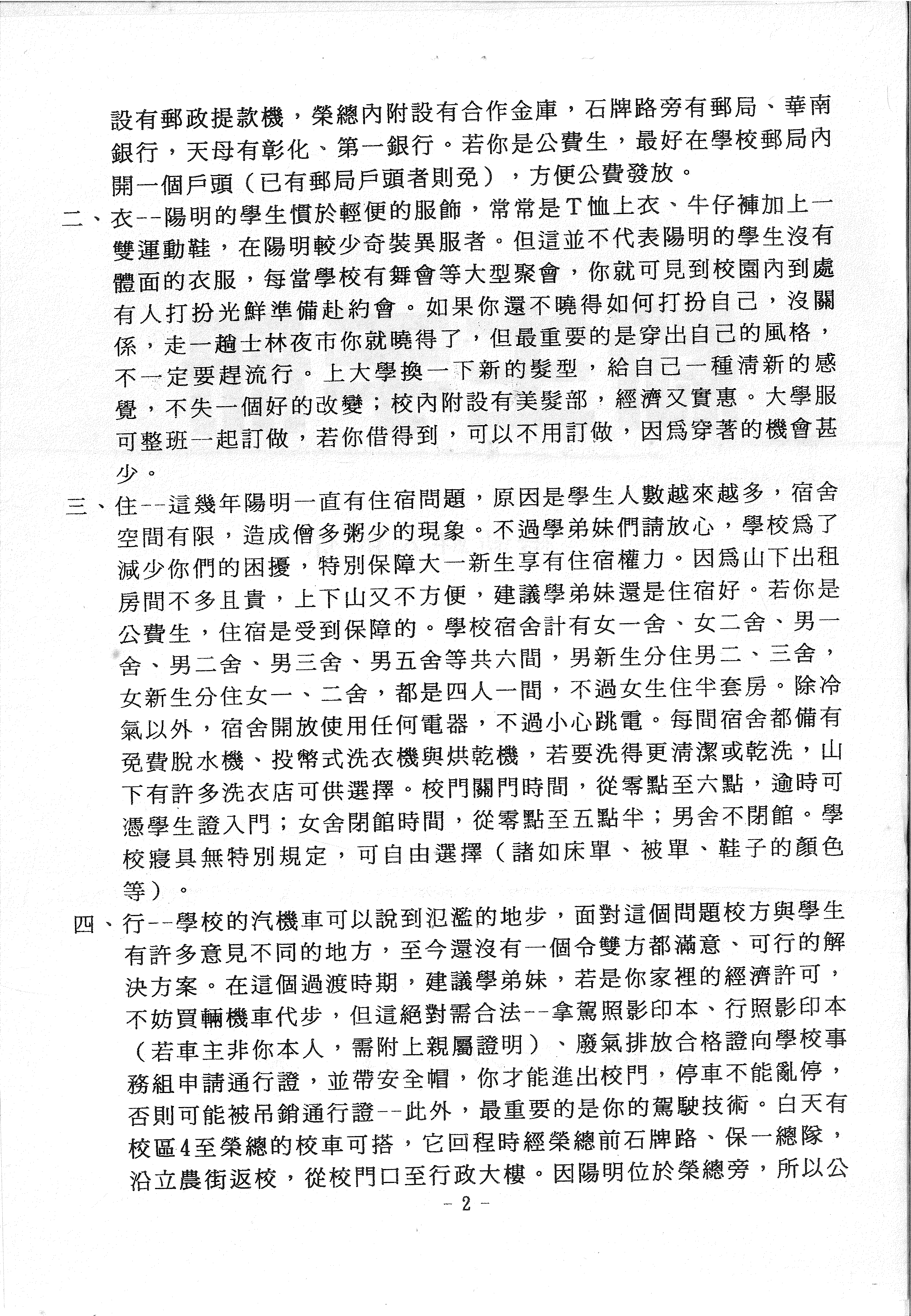 設有郵政提款機,榮總內附設有合作金庫,石牌路旁有郵局、華南 銀行,天母有彰化、第一銀行。若你是公費生,最好在學校郵局內 開一個戶頭(已有郵局戶頭者則免),方便公費發放。 二、衣--陽明的學生慣於輕便的服飾,常常是T恤上衣、牛仔褲加上一 雙運動鞋,在陽明較少奇裝異服者。但這並不代表陽明的學生沒有 體面的衣服,每當學校有舞會等大型聚會,你就可見到校園內到處 有人打扮光鮮準備赴約會。如果你還不曉得如何打扮自己,沒關 係,走一趟士林夜市你就曉得了,但最重要的是穿出自己的風格, 不一定要趕流行。上大學換一下新的髮型,給自己一種清新的感 覺,不失一個好的改變;校內附設有美髮部,經濟又實惠。大學服 可整班一起訂做,若你借得到,可以不用訂做,因為穿著的機會甚 少。 三、住--這幾年陽明一直有住宿問題,原因是學生人數越來越多,宿舍 空間有限,造成僧多粥少的現象。不過學弟妹們請放心,學校為了 減少你們的困擾,特別保障大一新生享有住宿權力。因為山下出租 房間不多且貴,上下山又不方便,建議學弟妹還是住宿好。若你是 公費生,住宿是受到保障的。學校宿舍計有女一舍、女二舍、男一 舍、男二舍、男三舍、男五舍等共六間,男新生分住男二、三舍, 女新生分住女一、二舍,都是四人一間,不過女生住半套房。除冷 氣以外,宿舍開放使用任何電器,不過小心跳電。每間宿舍都備有 免費脫水機、投幣式洗衣機與烘乾機,若要洗得更清潔或乾洗,山 下有許多洗衣店可供選擇。校門關門時間,從零點至六點,逾時可 憑學生證入門;女舍閉館時間,從零點至五點半;男舍不閉館。學 校寢具無特別規定,可自由選擇(諸如床單、被單、鞋子的顏色 等)。 四、行--學校的汽機車可以說到氾濫的地步,面對這個問題校方與學生 有許多意見不同的地方,至今還沒有一個令雙方都滿意、可行的解 決方案。在這個過渡時期,建議學弟妹,若是你家裡的經濟許可, 不妨買輛機車代步,但這絕對需合法--拿駕照影印本、行照影印本 (若車主非你本人,需附上親屬證明)、廢氣排放合格證向學校事 務組申請通行證,並帶安全帽,你才能進出校門,停車不能亂停, 否則可能被吊銷通行證--此外,最重要的是你的駕駛技術。白天有 校區4至榮總的校車可搭,它回程時經榮總前石牌路、保一總隊, 沿立農街返校,從校門口至行政大樓。因陽明位於榮總旁,所以公