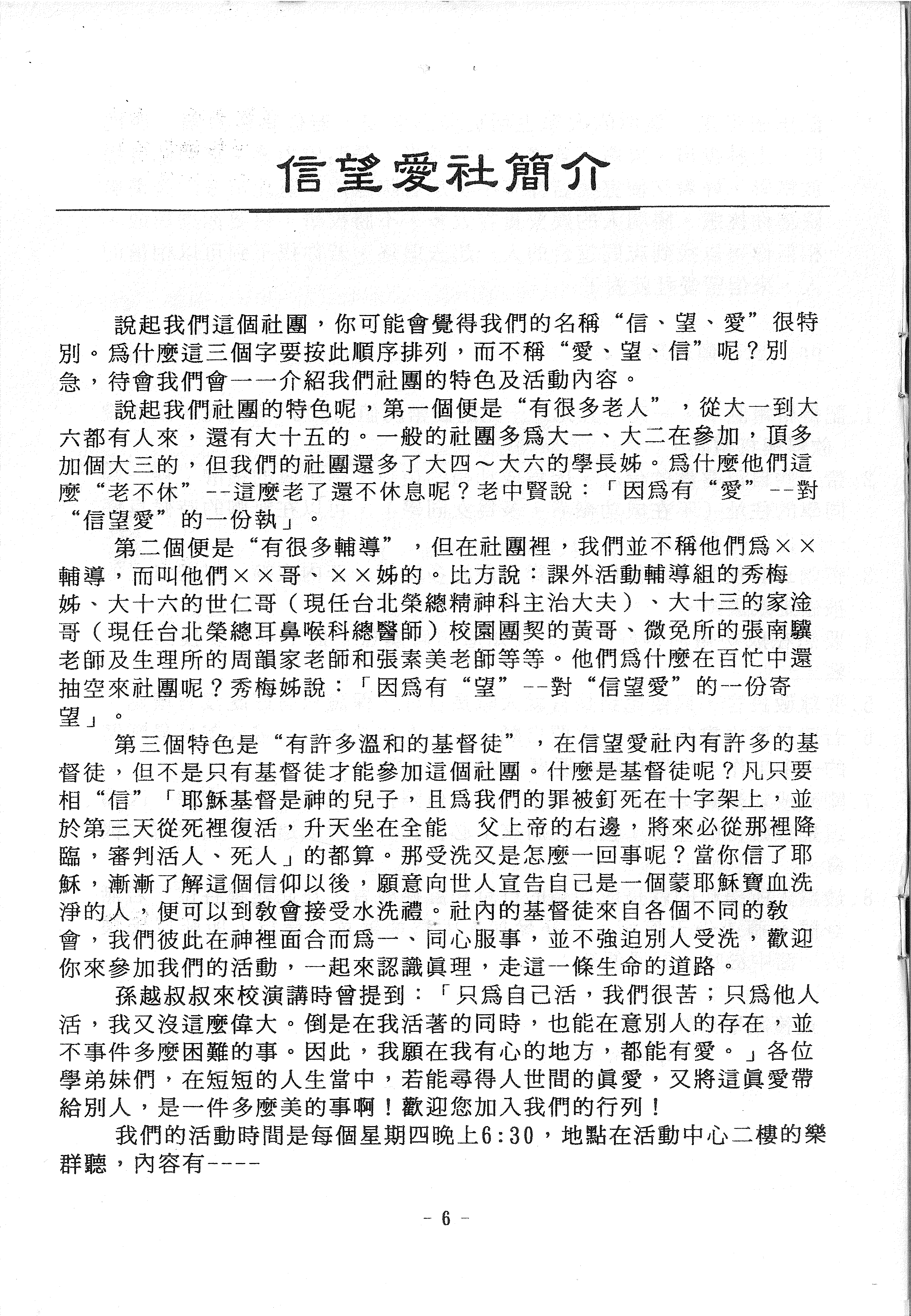 此頁為信望愛社的簡介,說明社團名稱的由來與特色,包括有許多學長姊和輔導的參與。內容也介紹了基督徒的定義,並歡迎大家參加社團活動。頁面最後提到社團的固定活動時間和地點。