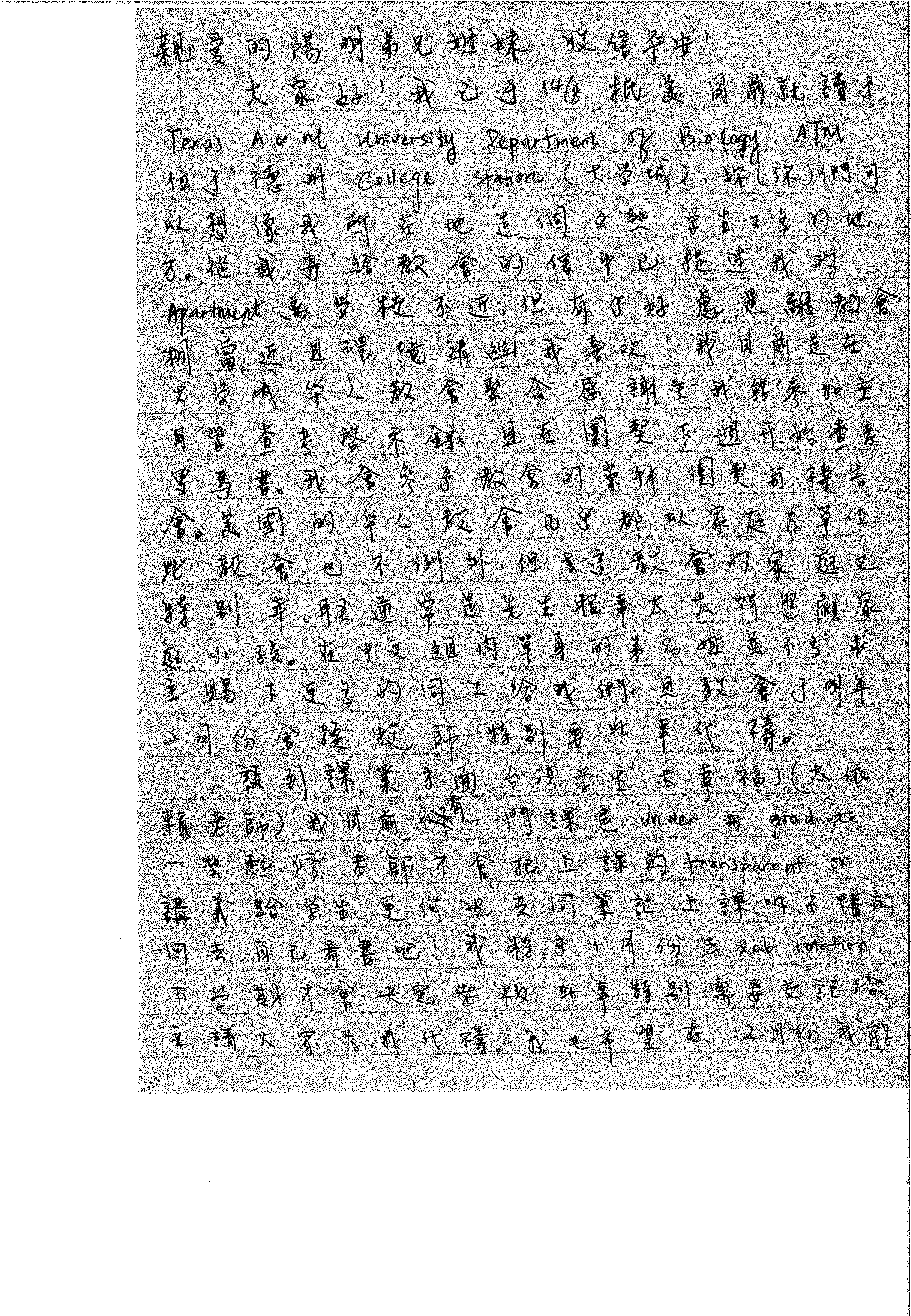 親愛的陽明弟兄姐妹:收信平安! 大家好!我已於14/8抵美。目前就讀於 Texas A&M University Department of Biology. ATM 位於德州 College Station (大學城),妳(你)們可 以想像我所在地是個又熱,學生又多的地 方。從我寄給教會的信中已提過我的 Apartment離學校不近,但有丁好處是離教會 相當近,且環境清幽。我喜歡!我目前是在 大學城華人教會聚會。感謝主我能參加主 日學查考啟示錄,且在團契下週開始查考 羅馬書。我會參與教會的崇拜、團契與禱告 會。美國的華人教會幾乎都以家庭為單位, 此教會也不例外,但這教會的家庭又 特別年輕,通常是先生服事,太太得照顧家 庭小孩。在中文組內單身的弟兄姐並不多,求 主賜下更多的同工給我們。且教會於明年 2月份會換牧師,特別要此事代禱。 談到課業方面,台灣學生太幸福了(太依 賴老師)。我目前有一門課是 under 與 graduate 一起修。老師不會把上課的 transparent or 講義給學生。更何況共同筆記。上課聽不懂的 回去自己看書吧!我將於十月份去 lab rotation, 下學期才會決定老闆。此事特別需要交託給 主,請大家為我代禱。我也希望在12月份我能