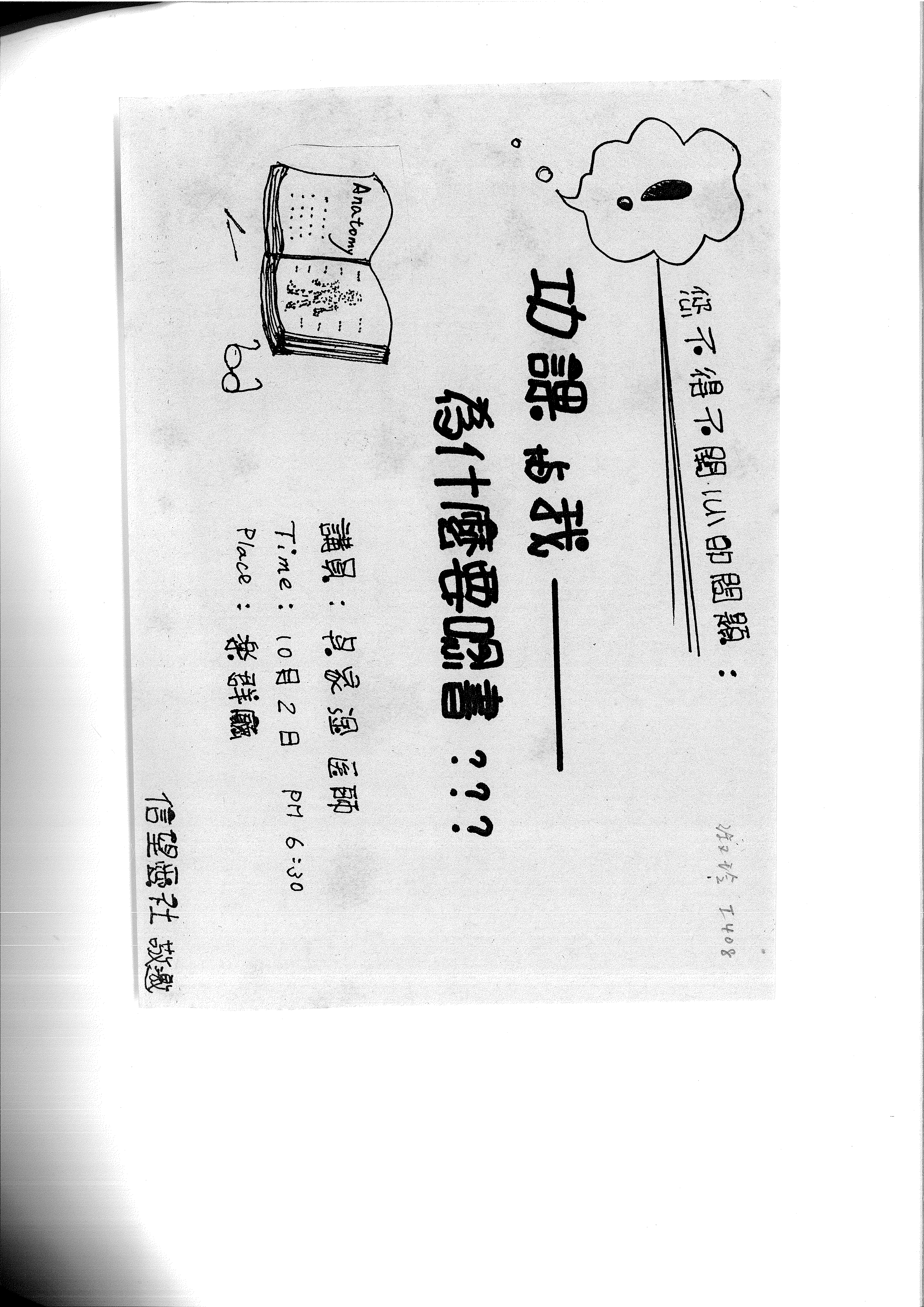 ← 屬於文件:陽明信望愛社81學年度第一學期活動記錄與會議資料 (47 頁 · 聚會筆記)這是一張陽明信望愛團契的聚會邀請函,主題為「您不得不關心的問題: 為什麼要唸書???」。講員是吳家溫醫師,聚會時間為10月2日晚上6:30,地點在系群廳。