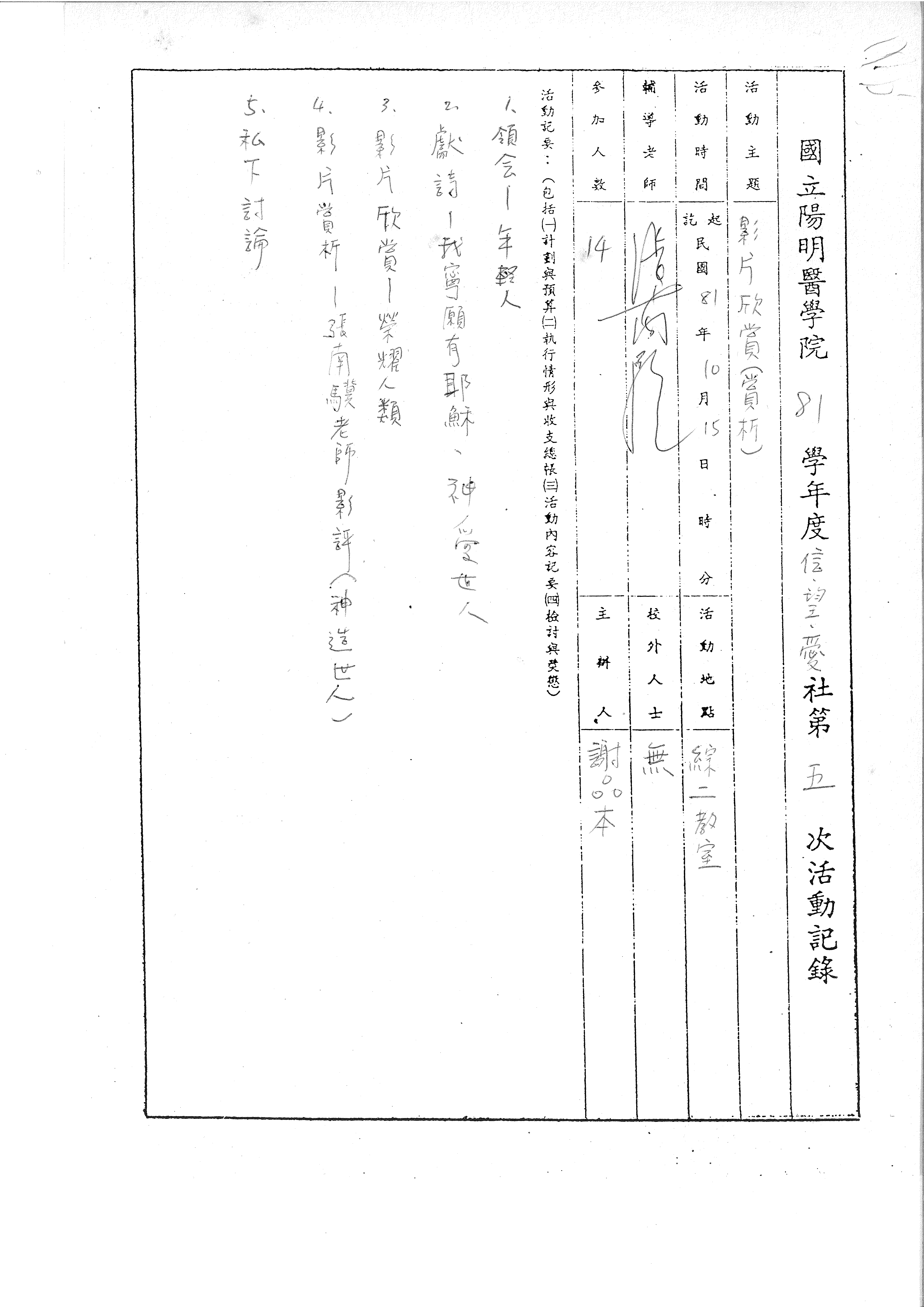 ← 屬於文件:陽明信望愛社81學年度第一學期活動記錄與會議資料 (47 頁 · 聚會筆記)這是一份國立陽明醫學院信望愛社81學年度第五次活動記錄。活動主題為影片欣賞與賞析,於民國81年10月15日在綜二教室舉行。活動內容包括獻詩、影片「榮耀人類」欣賞及張南驥老師的影評。