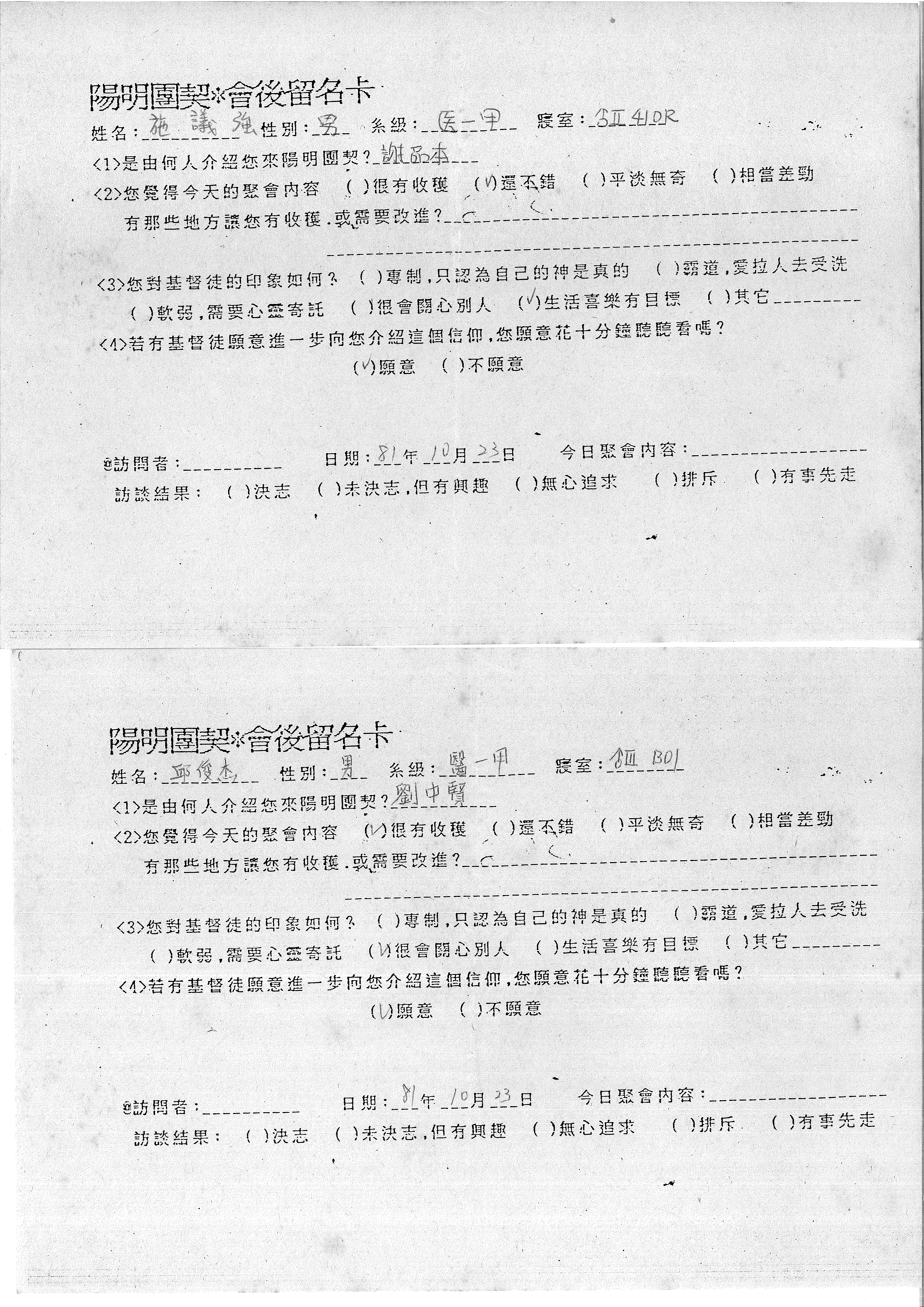 訪問者: __________ 日期: 81年 10月 23日 今日聚會內容: __________ 訪談結果: ( )決志 ( )未決志,但有興趣 ( )無心追求 ( )排斥 ( )有事先走