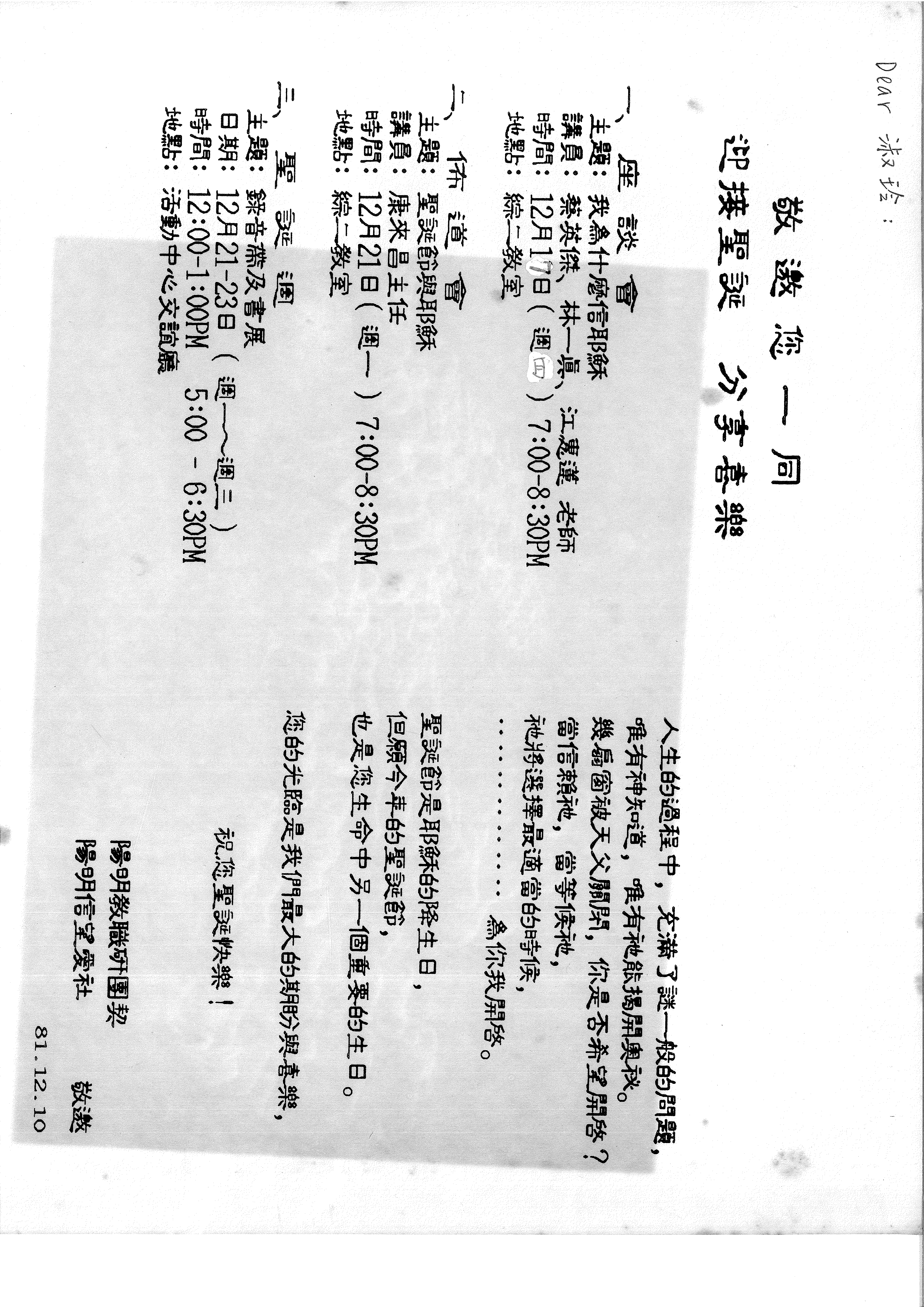 陽明教職研團契 陽明信望愛社 敬邀 81.12.10