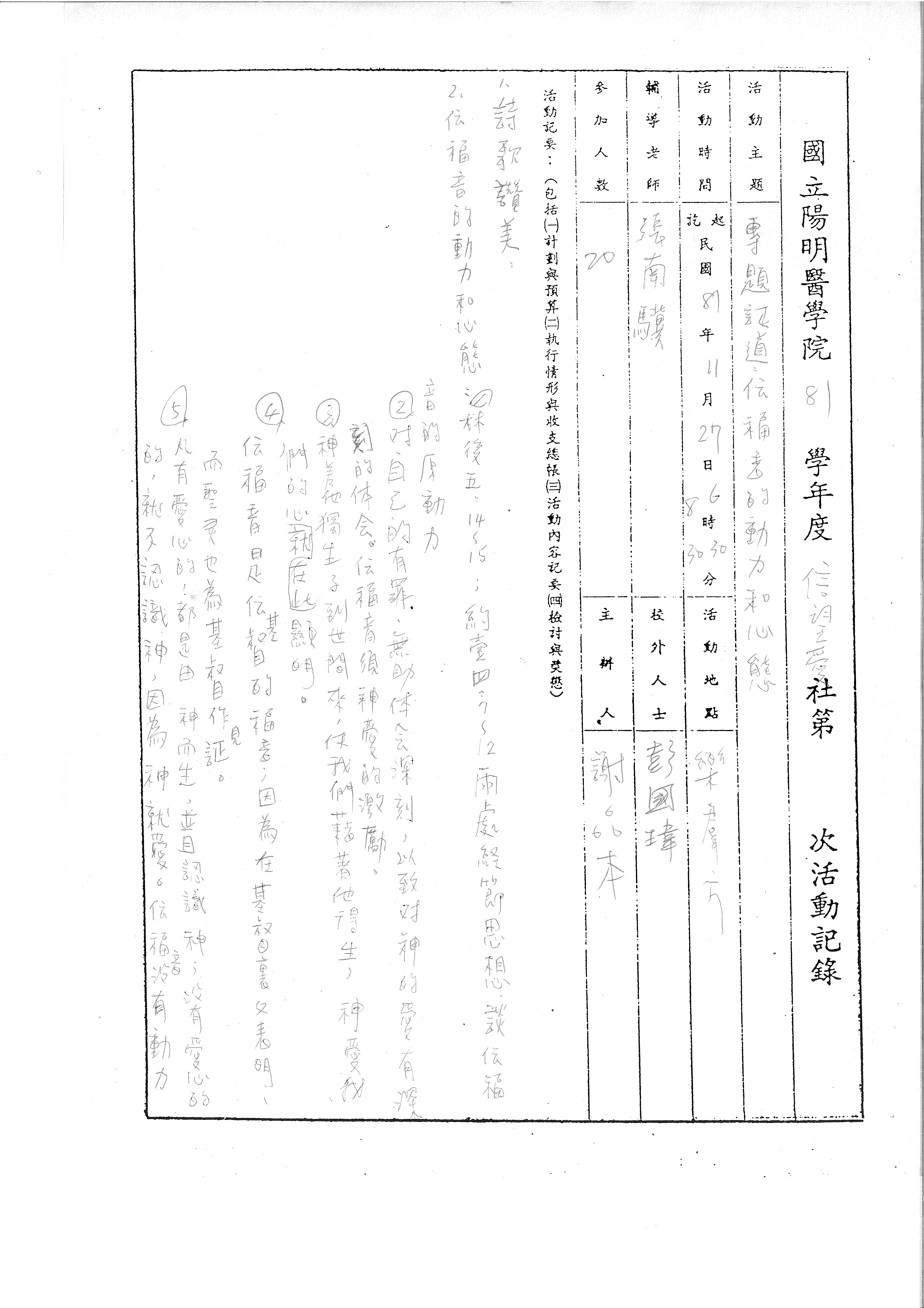 國立陽明醫學院 81 學年度 信望愛社第 [ ] 次活動記錄