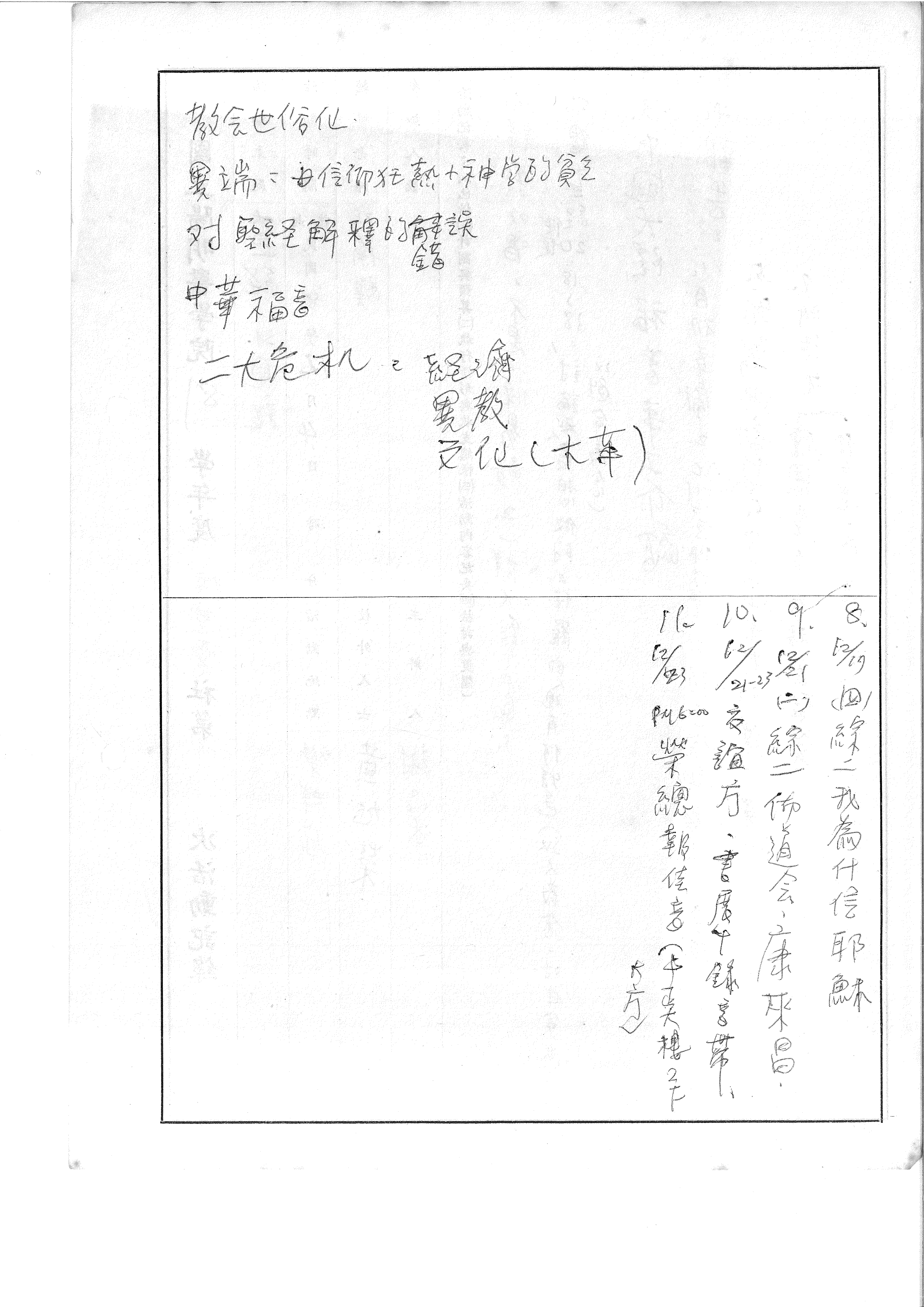 ← 屬於文件:陽明信望愛社81學年度第一學期活動記錄與會議資料 (47 頁 · 聚會筆記)此頁包含關於教會世俗化、異端、神學貧乏及聖經解釋謬誤等討論主題,並列出經濟、異教、文化三大危機。此外,還記錄了民國84年8月21日至24日期間的活動,包括綜一佈道會、郊遊和展覽,並提及榮總輔導佳惠、王美琪、王正己及大方等人。