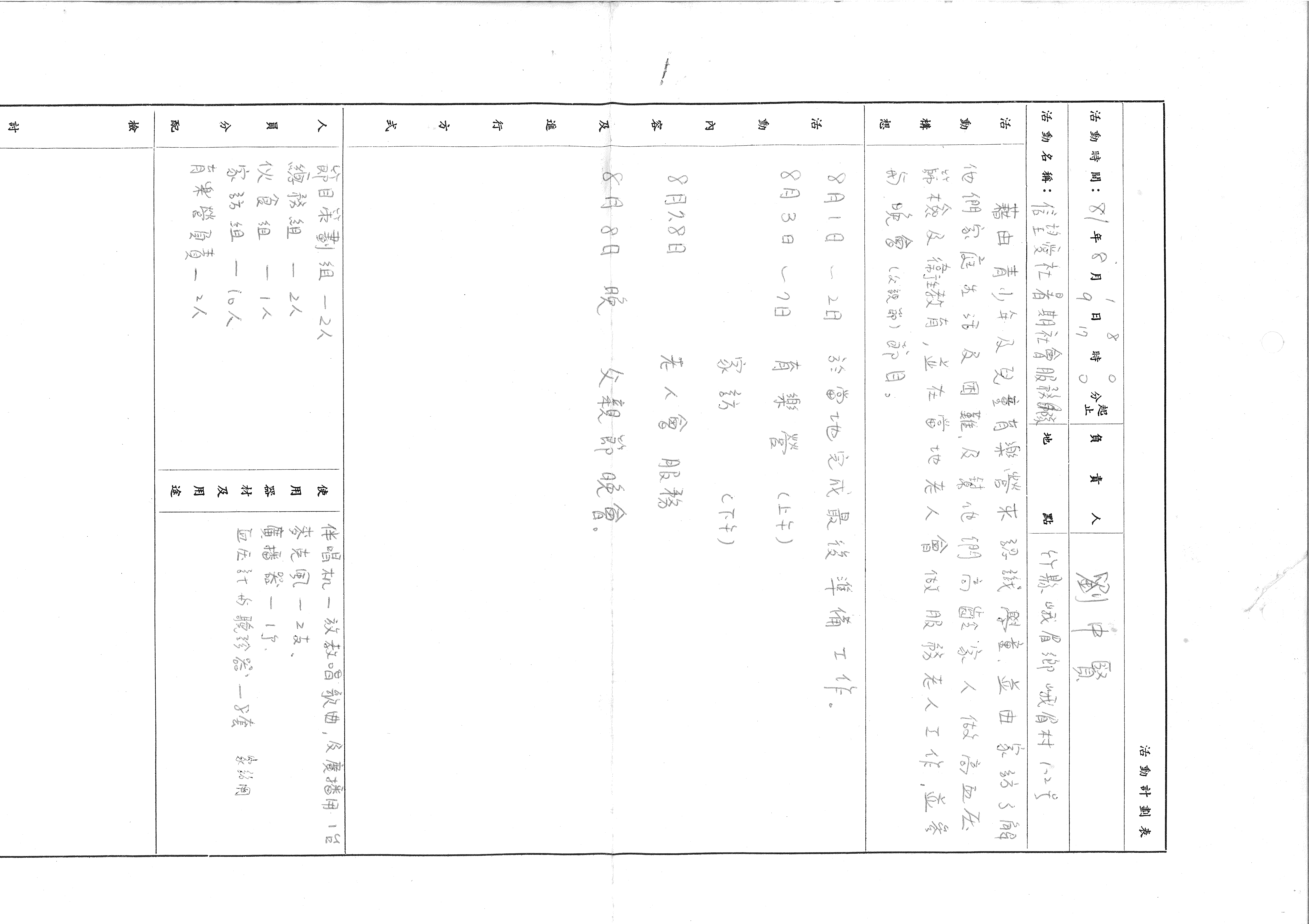 8月1日~2日 於當地完成最後準備工作。 8月3日 育樂營(上午) 家訪(下午) 8月7日 老人會服務 8月8日 晚 父親節晚會。 |