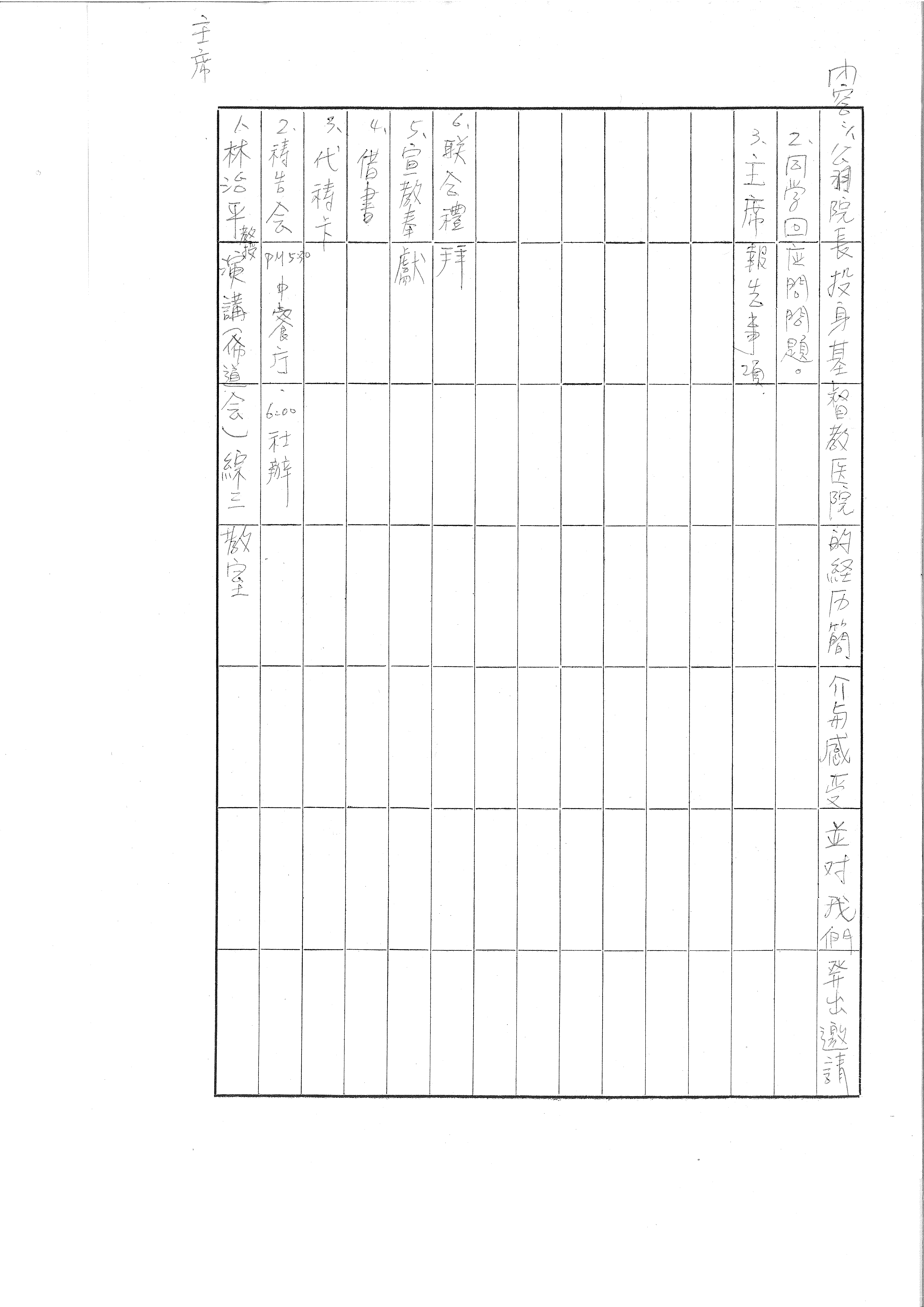 | 一、宏祖院長投身基督教医院的經歷簡介与感受並对我們提出邀請 | 二、同学回应的問題 | 三、主席報告事項 | 6. 聯合禮拜 | 5. 宣教奉獻 | 4. 借書 | 3. 代禱卡 | 2. 禱告会 | 1. 林治平 |