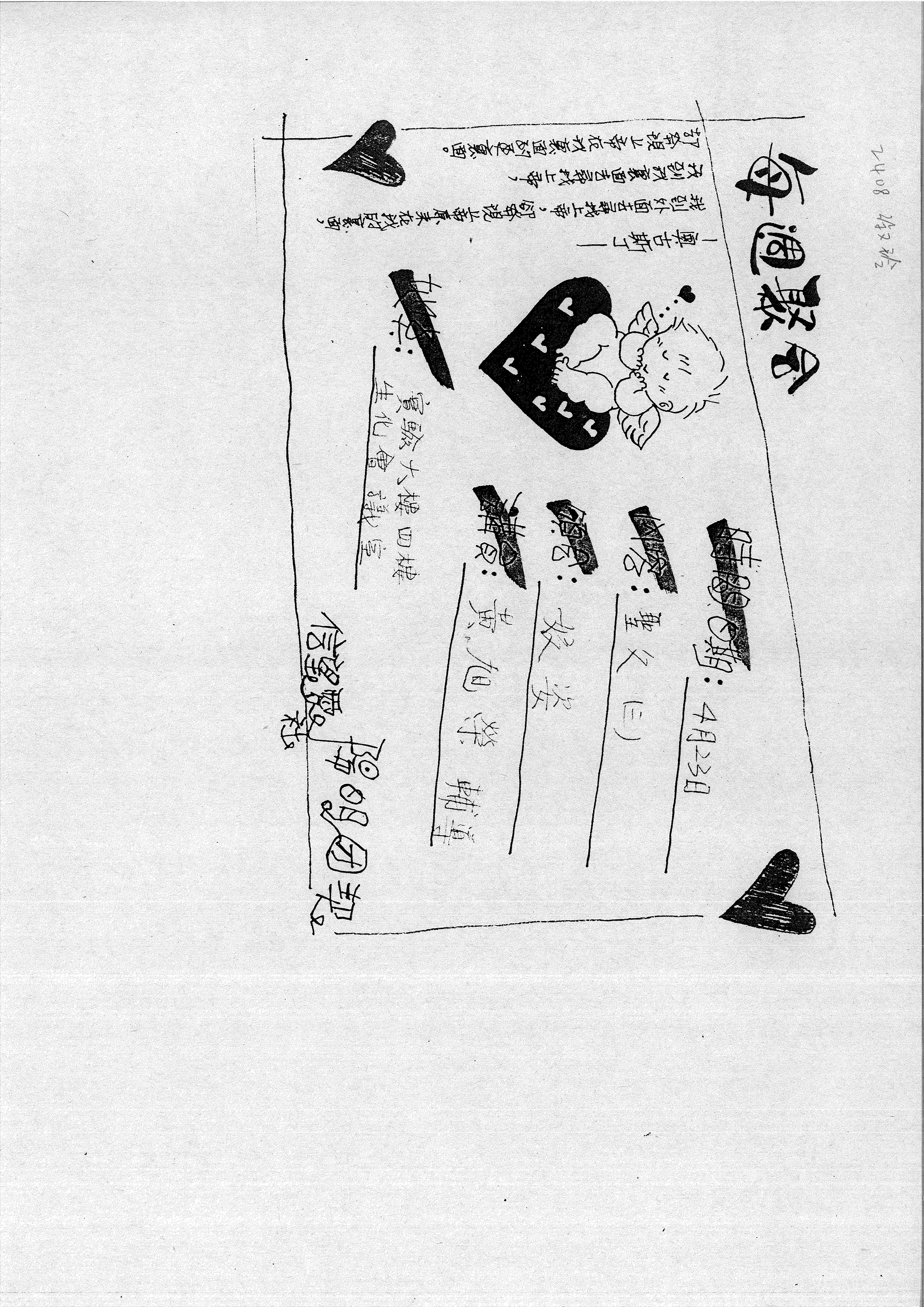 ← 屬於文件:國立陽明醫學院 81學年度信望愛社會議及活動記錄 (38 頁 · 聚會筆記)此頁為一場每週聚會的通知,列出了聚會日期、講員黃旭榮輔導、以及地點。頁面中也引用了奧古斯丁關於尋找上帝的語錄。