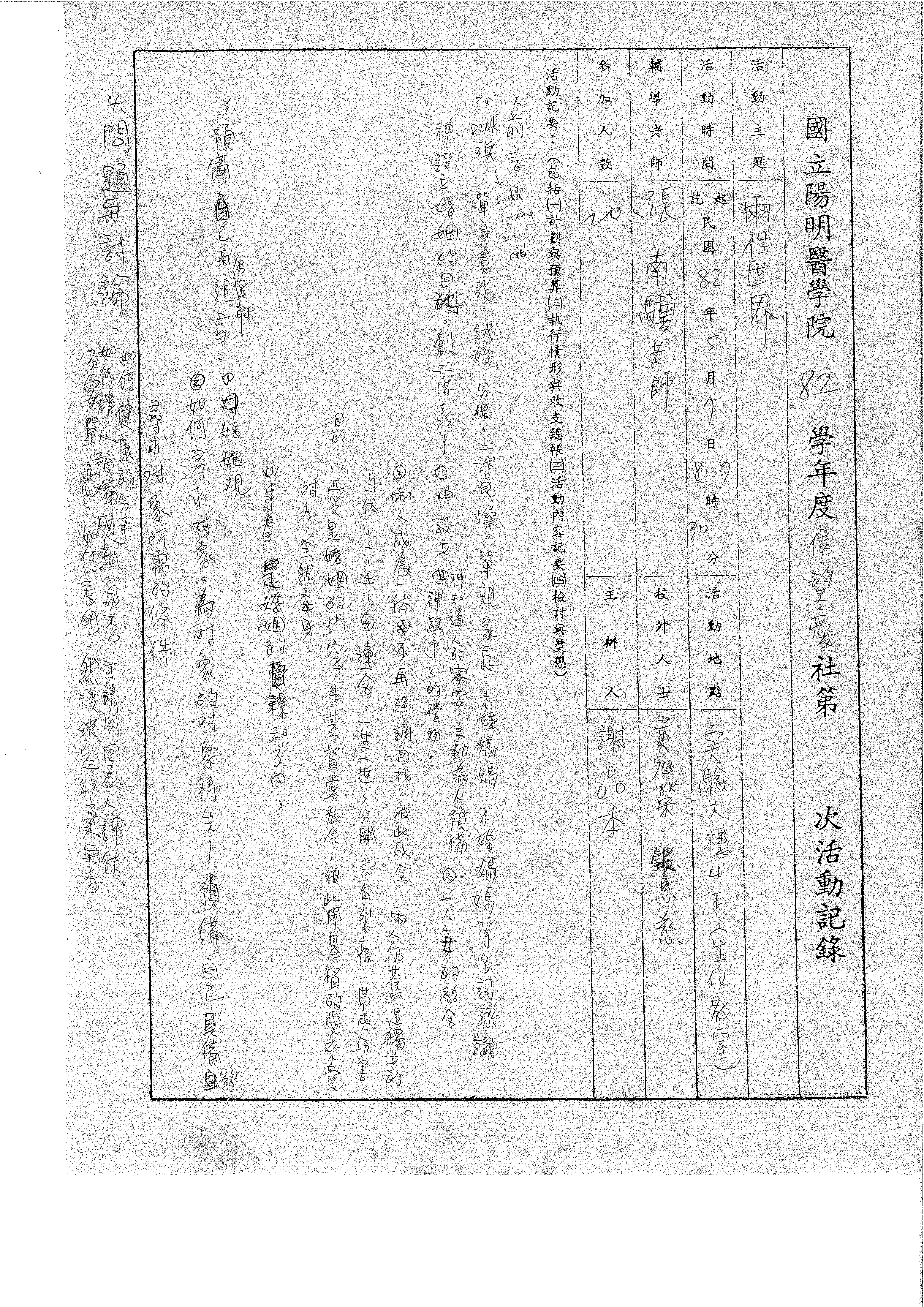 國立陽明醫學院 82 學年度信望愛社第 [?] 次活動記錄