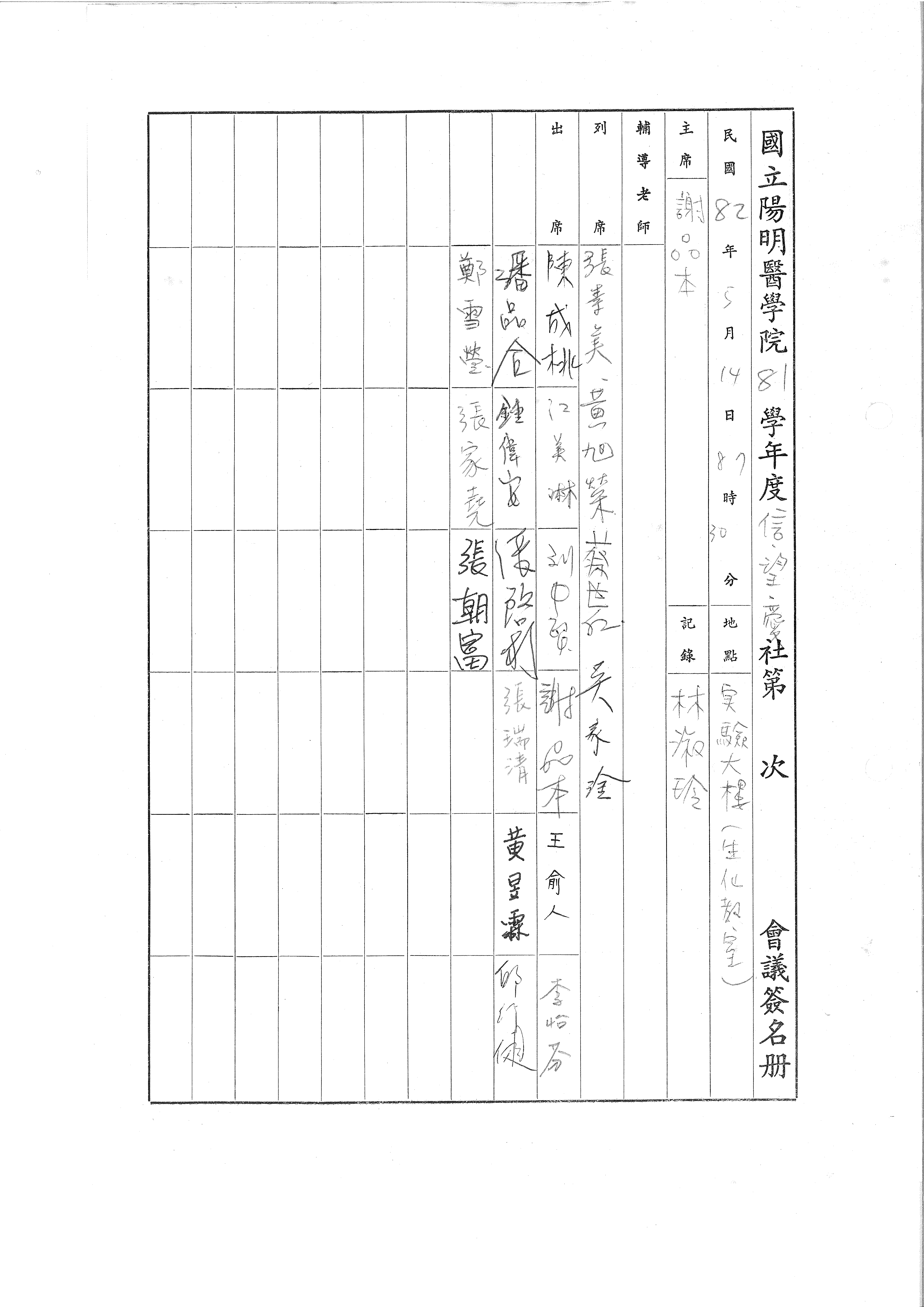 ← 屬於文件:國立陽明醫學院 81學年度信望愛社會議及活動記錄 (38 頁 · 聚會筆記)此頁為國立陽明醫學院信、望、愛社於民國82年5月14日(81學年度)在實驗大樓生化教室舉行的第一次會議簽名册。內容列出了主席、記錄、輔導老師、列席人員及出席社員的姓名。