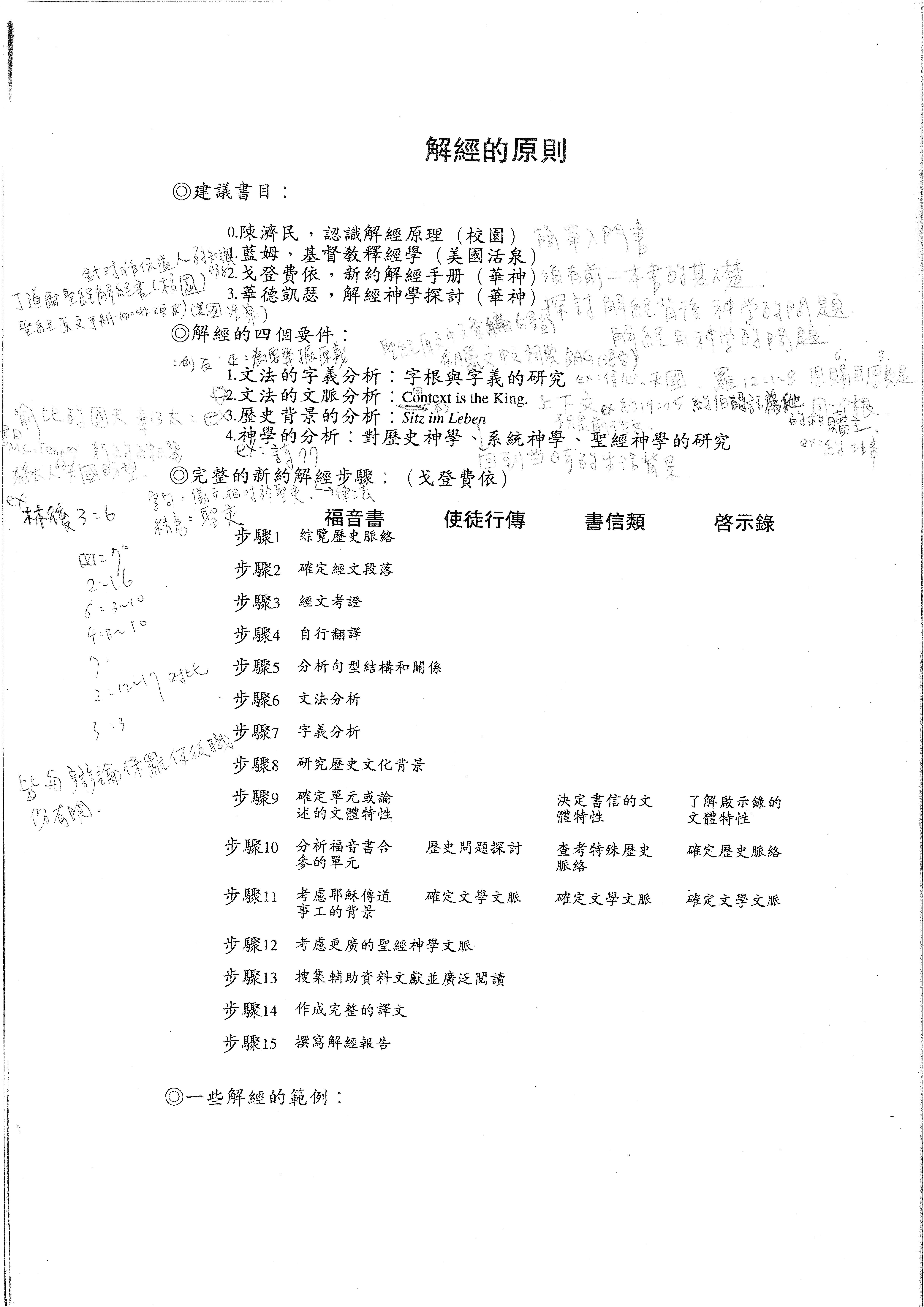 ◎建議書目: 0.陳濟民, 認識解經原理 (校園) 1.藍姆, 基督教釋經學 (美國活泉) 2.戈登費依, 新約解經手冊 (華神) 3.華德凱瑟, 解經神學探討 (華神)
