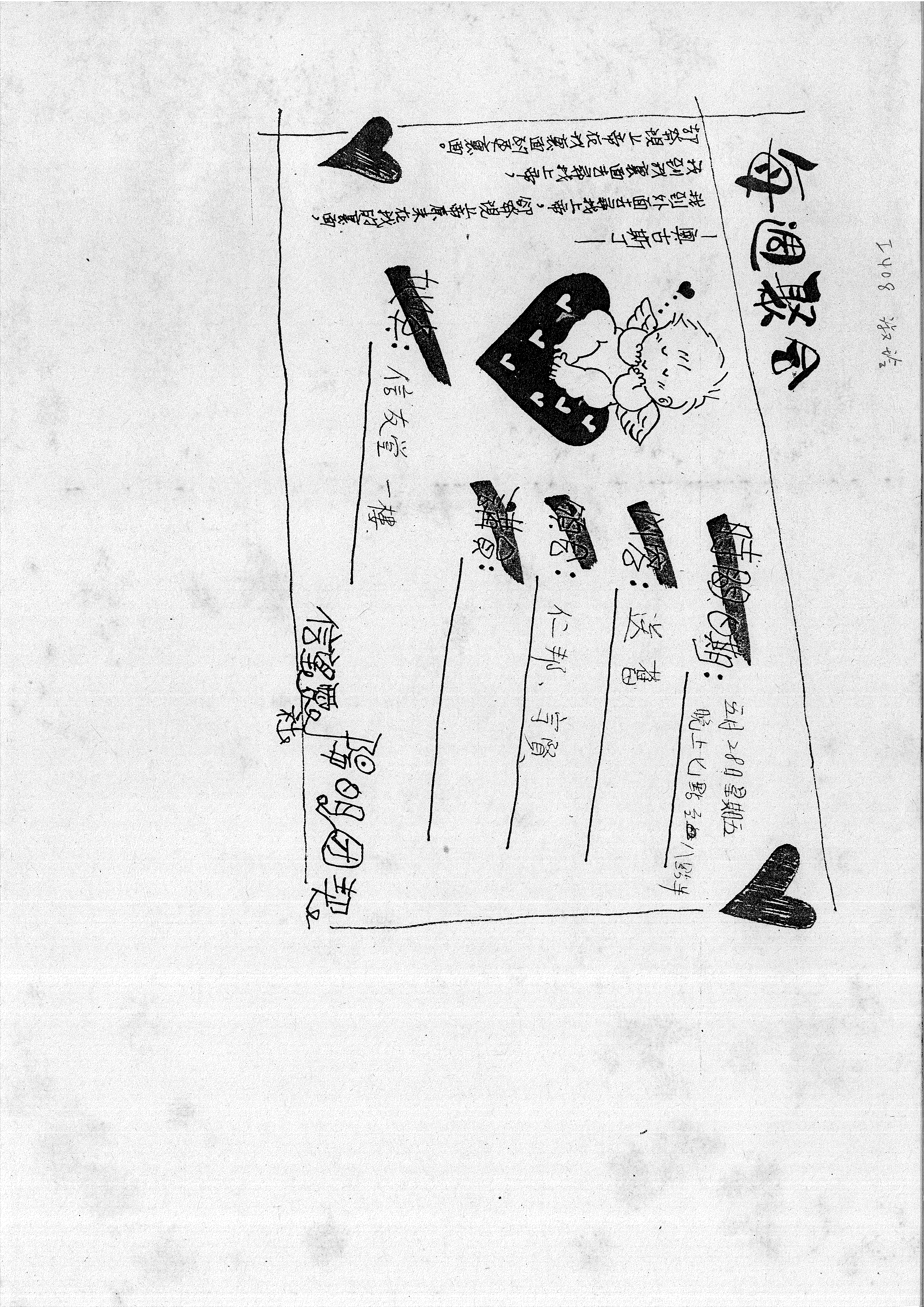 ← 屬於文件:國立陽明醫學院 81學年度信望愛社會議及活動記錄 (38 頁 · 聚會筆記)此頁為陽明信望愛團契的每週聚會通知,列出了聚會時間、地點、內容(送舊)及各項職務(主席、領詩、分享、司會)。頁面旁註有日期「80.4.1」及人名「淑玲」,並引用了奧古斯丁關於尋找上帝的語錄,以及一張手繪邱比特的插圖。