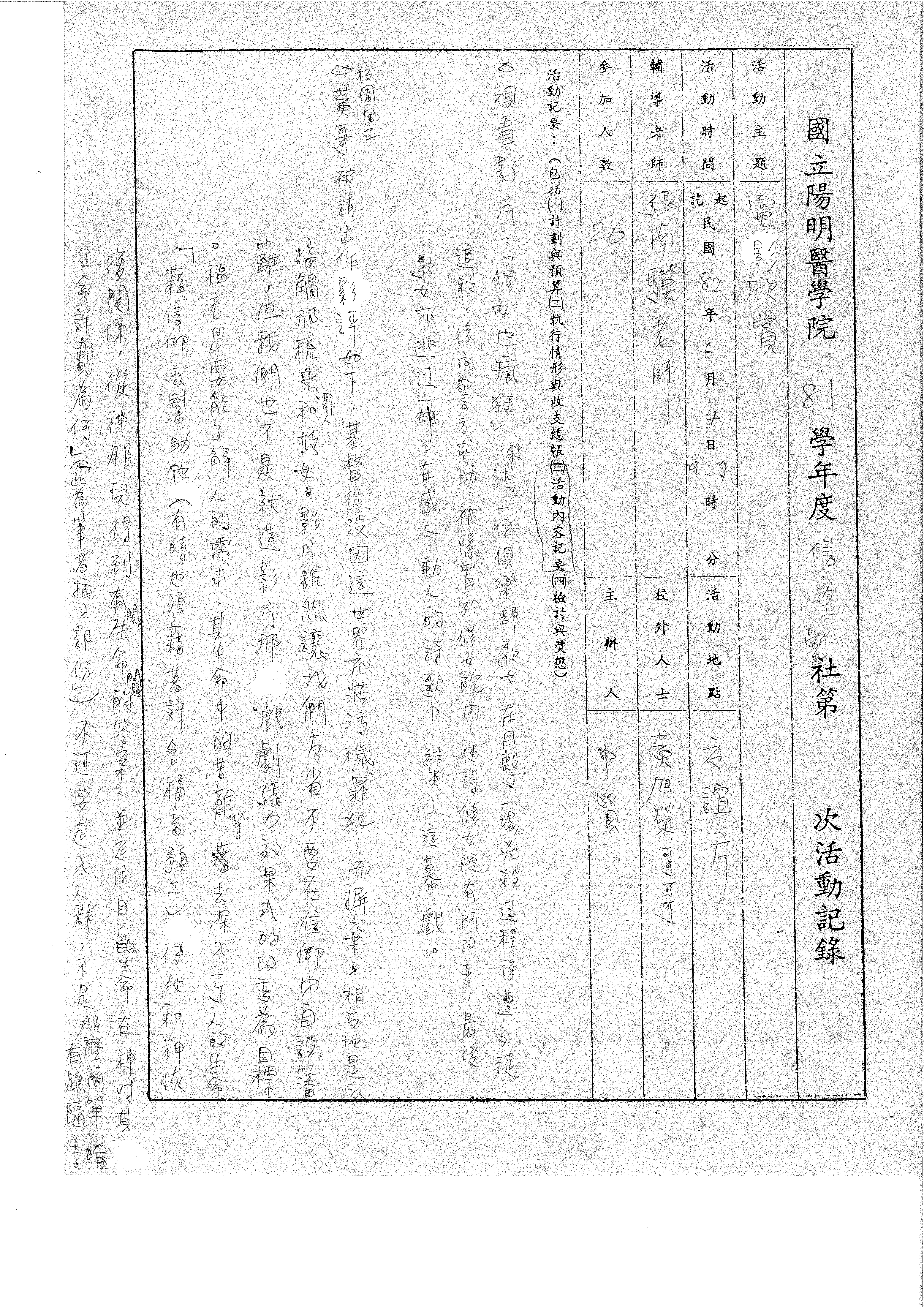 | 活動時間 | 起 民國 82 年 6 月 4 日 19~21 時 分 | 活動地點 | 二活前方 |