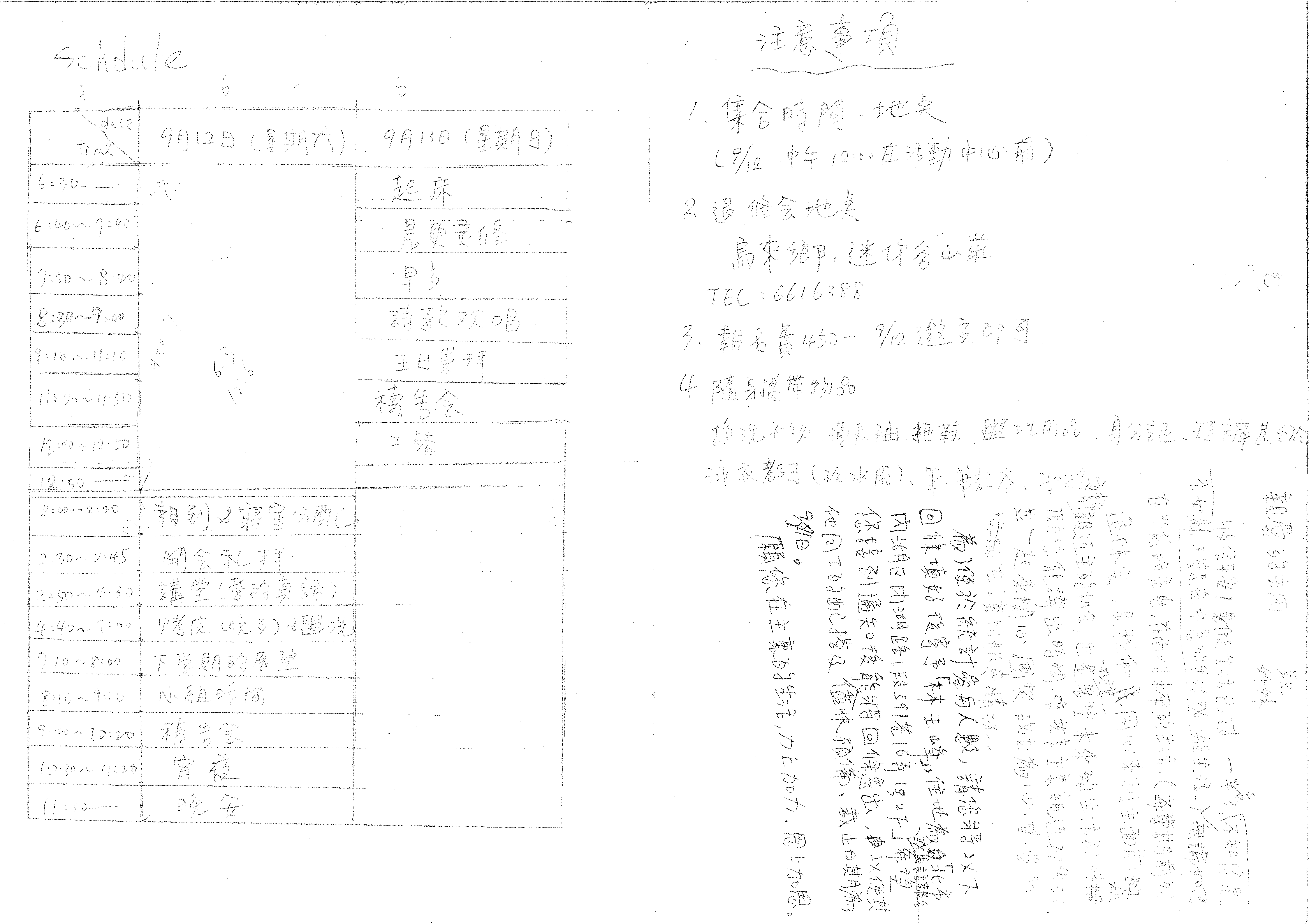 - 隨身攜帶物品 换洗衣物、薄長袖、拖鞋、盥洗用品、身分証、短褲甚[?] 泳衣都可(冷水用)、筆、筆記本、聖油