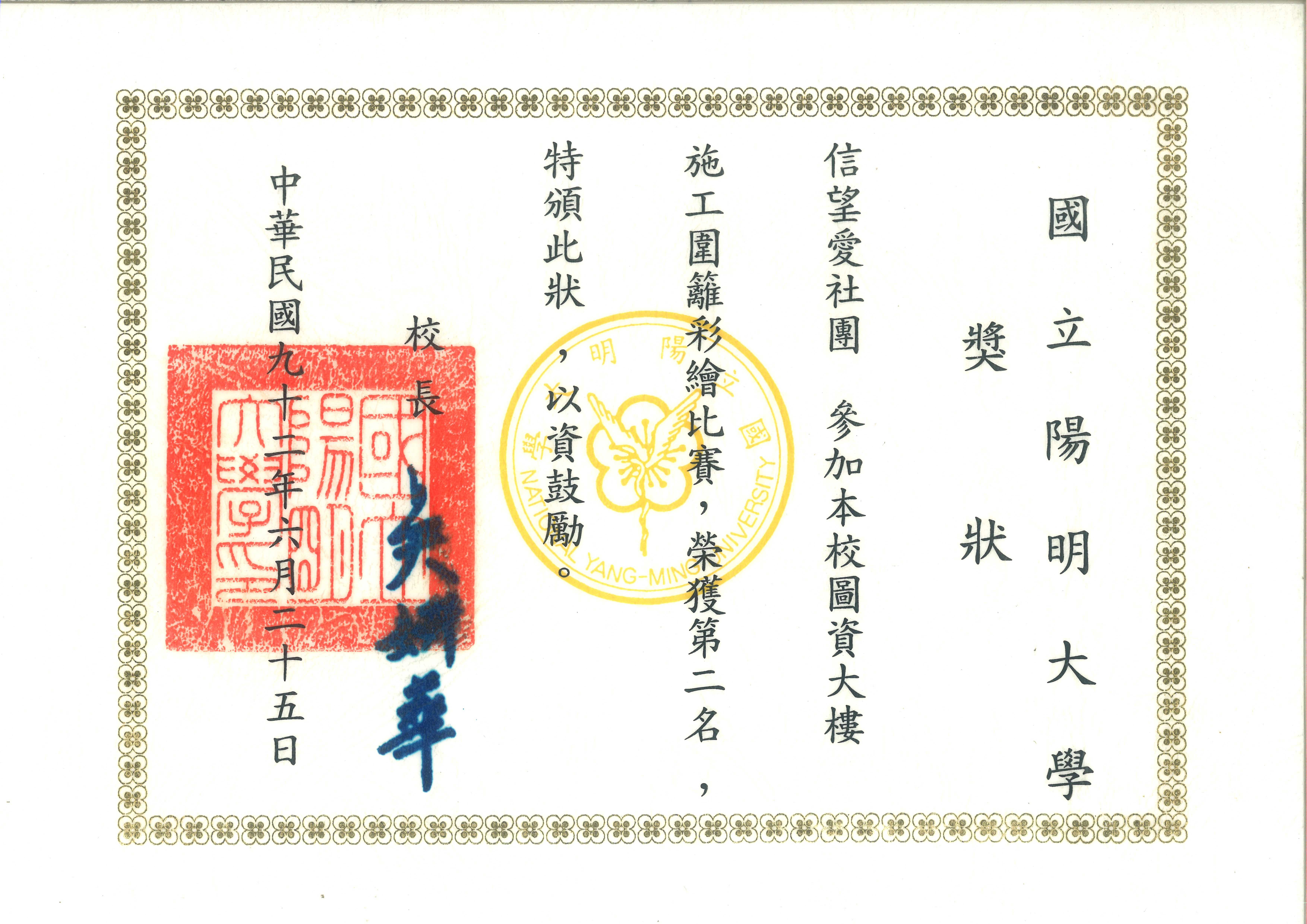 這是一張國立陽明大學頒發給信望愛社團的獎狀,表揚該社團在圖資大樓施工圍籬彩繪比賽中榮獲第二名。獎狀由校長吳妍華於中華民國九十二年六月二十五日頒發。