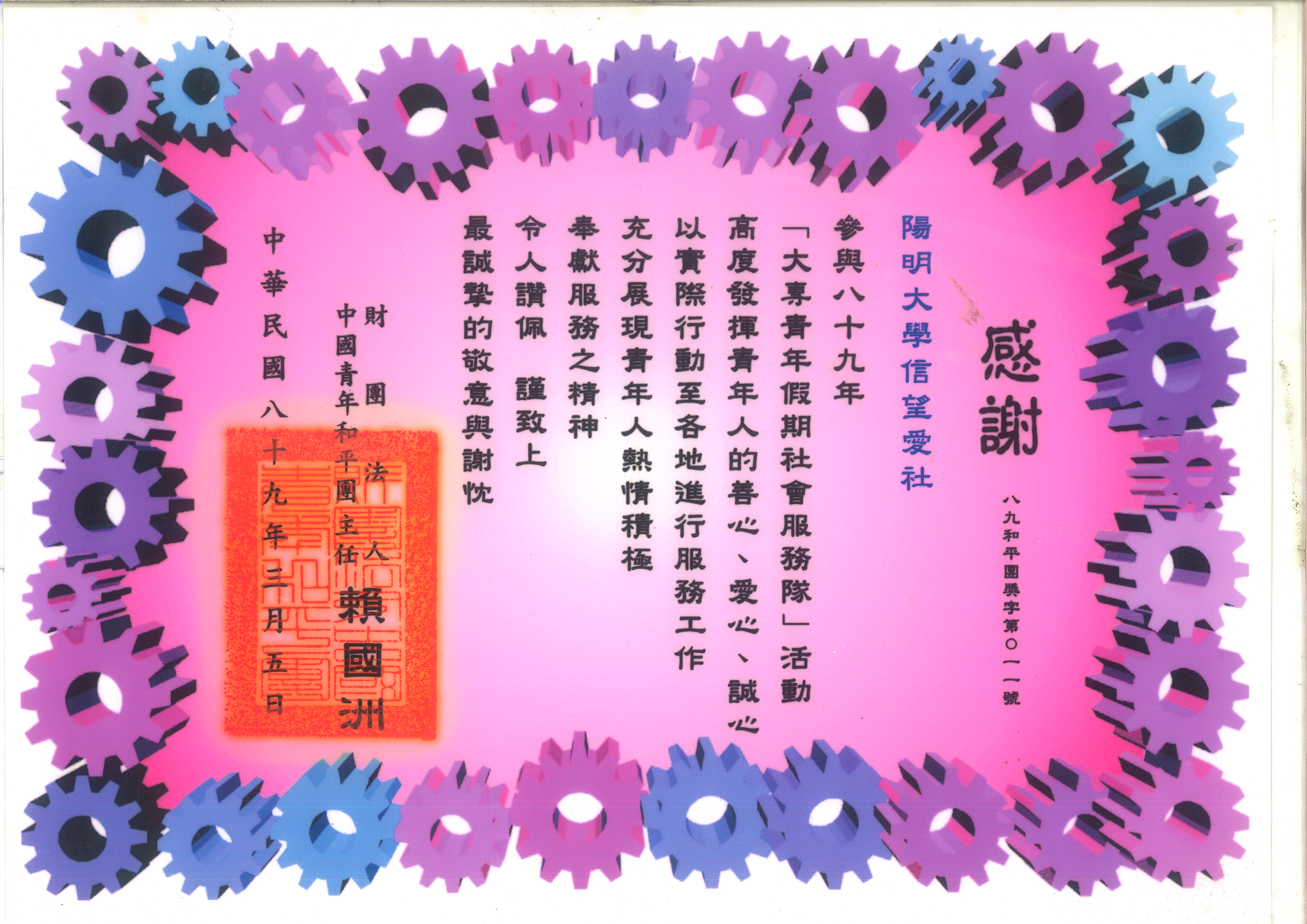 這是一張由財團法人中國青年和平團頒發給陽明大學信望愛社的感謝狀,感謝該社參與八十九年「大專青年假期社會服務隊」活動,發揮奉獻服務的精神。感謝狀的簽發日期為中華民國八十九年三月五日。